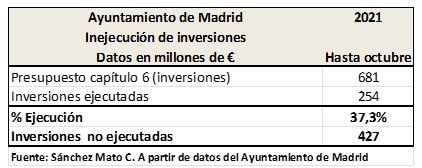 Cierto es que podría cualquiera pensar que para qué quieren más presupuesto si el que han aprobado para 2021 no son capaces de utilizarlo. De los 944 millones presupuestados para inversiones, solamente se han ejecutado el 40% a finales del mes de octubre. Específicamente de los 681 millones en capítulo 6, únicamente han realizado el 37%. En Vicálvaro la cosa es todavía peor, ya que solo han realizado un 29% de las inversiones ejecutadas. Si alguien tiene la tentación de comparar estos desastrosos niveles, peores que el promedio alcanzado en el pasado mandato, que incorpore a la ecuación las limitaciones impuestas por Montoro entre 2015 y 2018 y las paralizaciones judiciales de las inversiones realizadas a instancias del PP y Ciudadanos en esa etapa. Ahora, sin embargo, se han suspendido las reglas fiscales y no hay traba alguna y sus resultados a la hora de ejecutar las inversiones son inferiores.