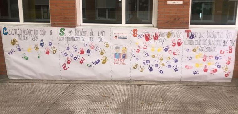 Por otra parte, los alumnos de 3º de marketing realizaron una pancarta con cuatro frases: “Cuando juego no dejo a nadie solo”, “Si se burlan de un compañero no me río”, “Si veo a alguien triste le apoyo” y “Tengo que tratar a los demás como me gustaría que me trataran”. Estas fueron leídas por los niños, quienes debían pintarse la mano y pegar su huella bajo la frase con la que se comprometieran a cumplir.