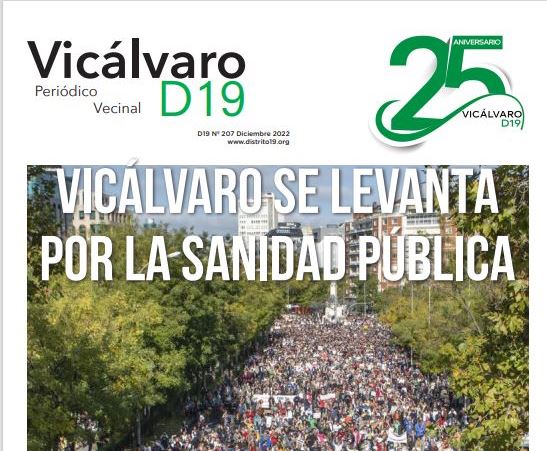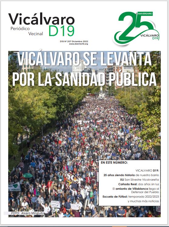 La gran manifestación en defensa de la sanidad pública de Madrid del pasado noviembre ocupa la portada del número 207 del periódico vecinal Vicálvaro Distrito 19, una publicación que el pasado junio cumplió 25 años. Otras noticias son: los 45 años de la FRAVM, la situación de La Cañada Real tras dos años sin luz o la XLI edición de la San Silvestre Vicálvareña.